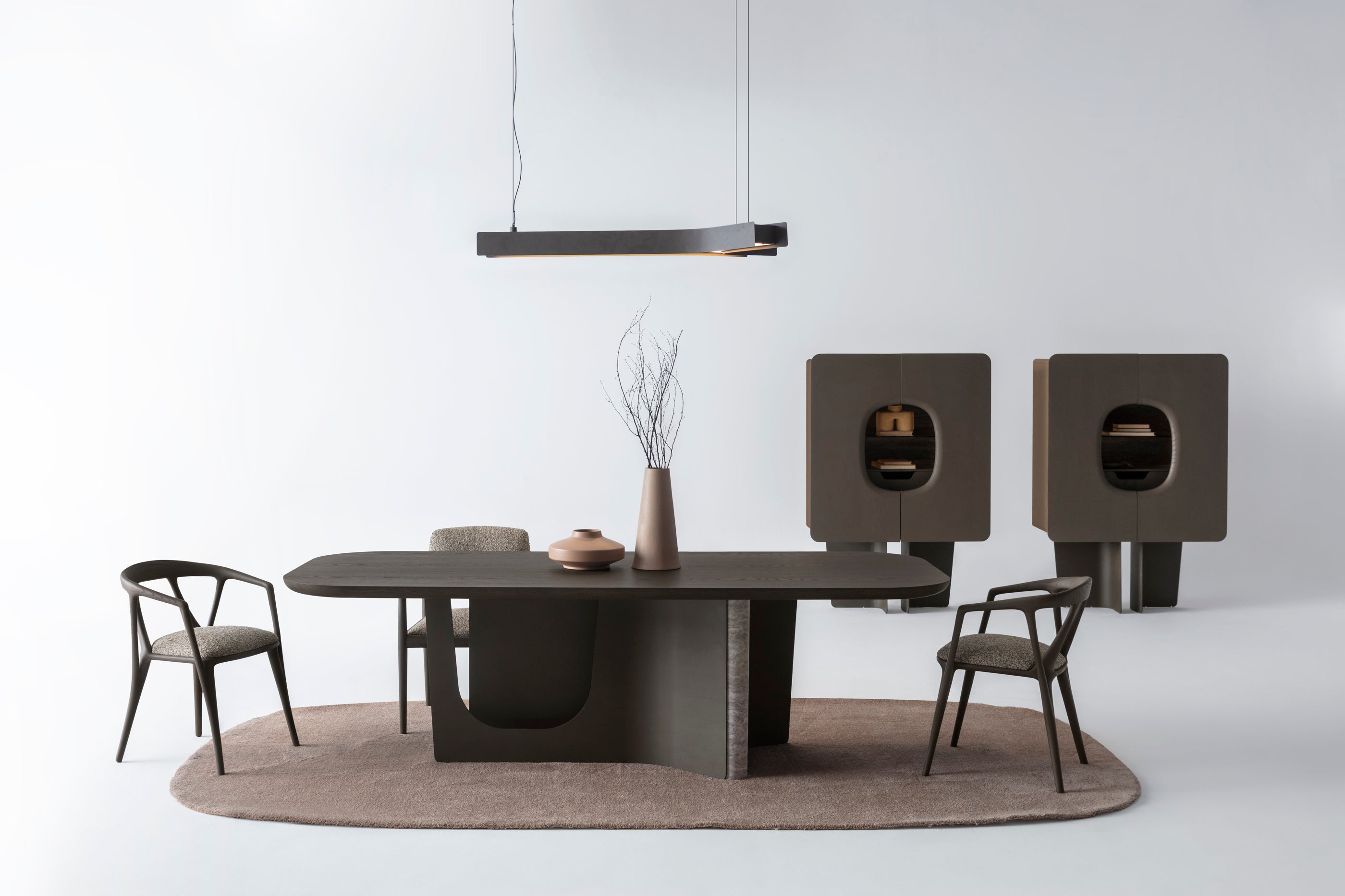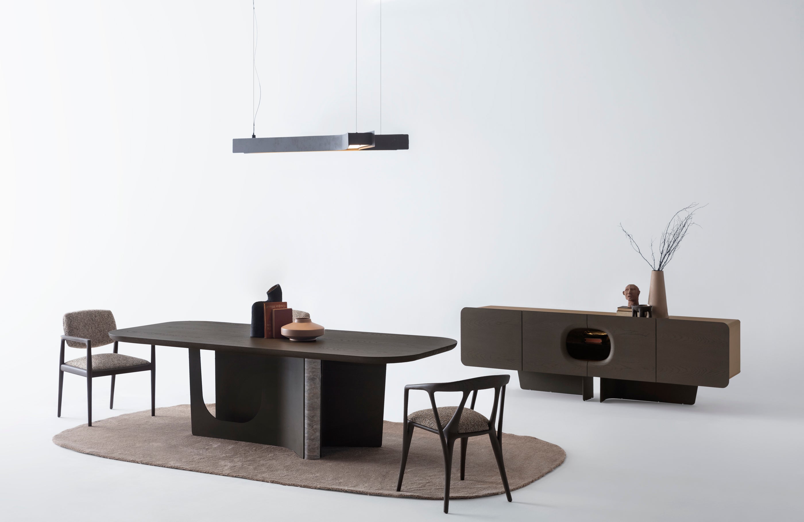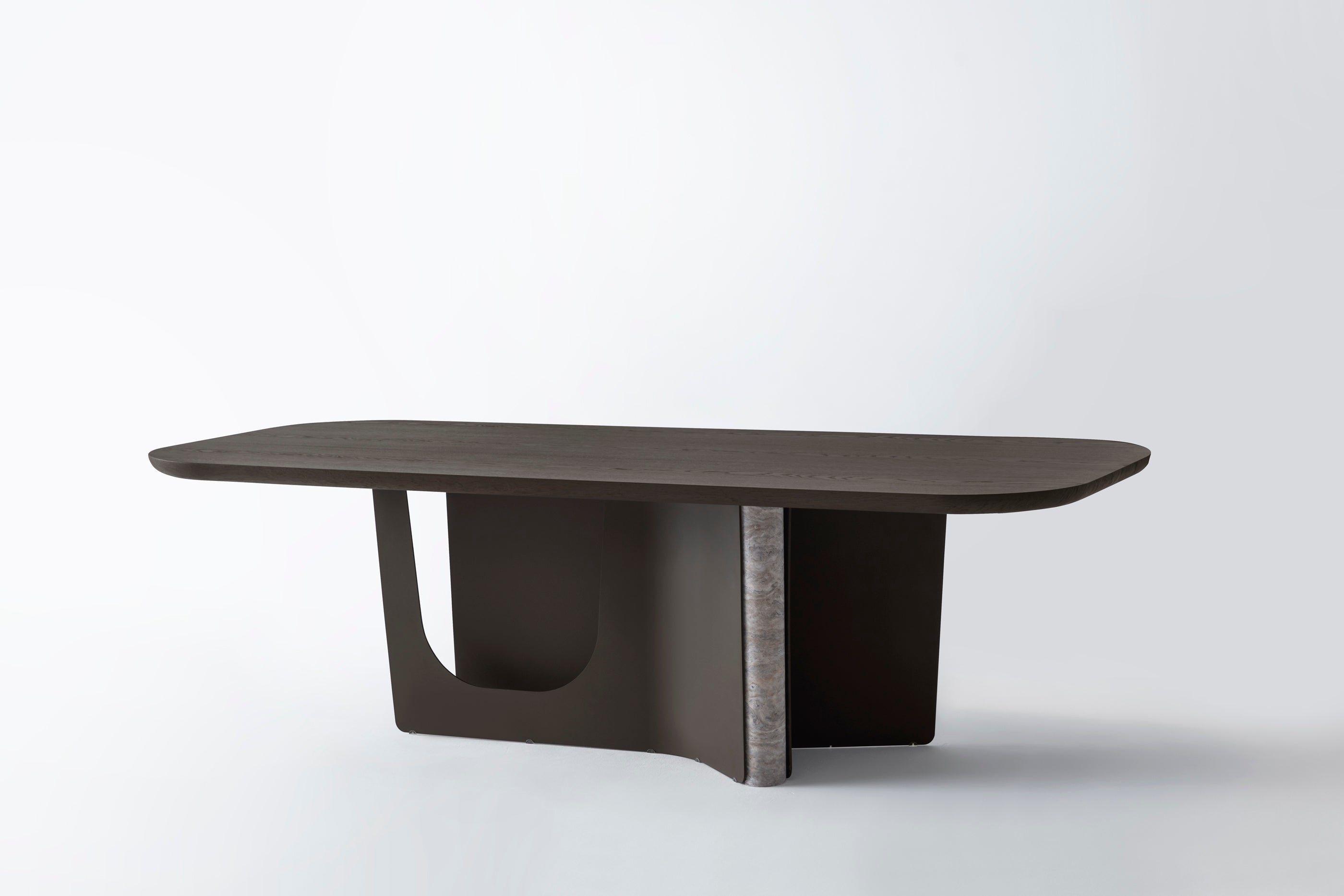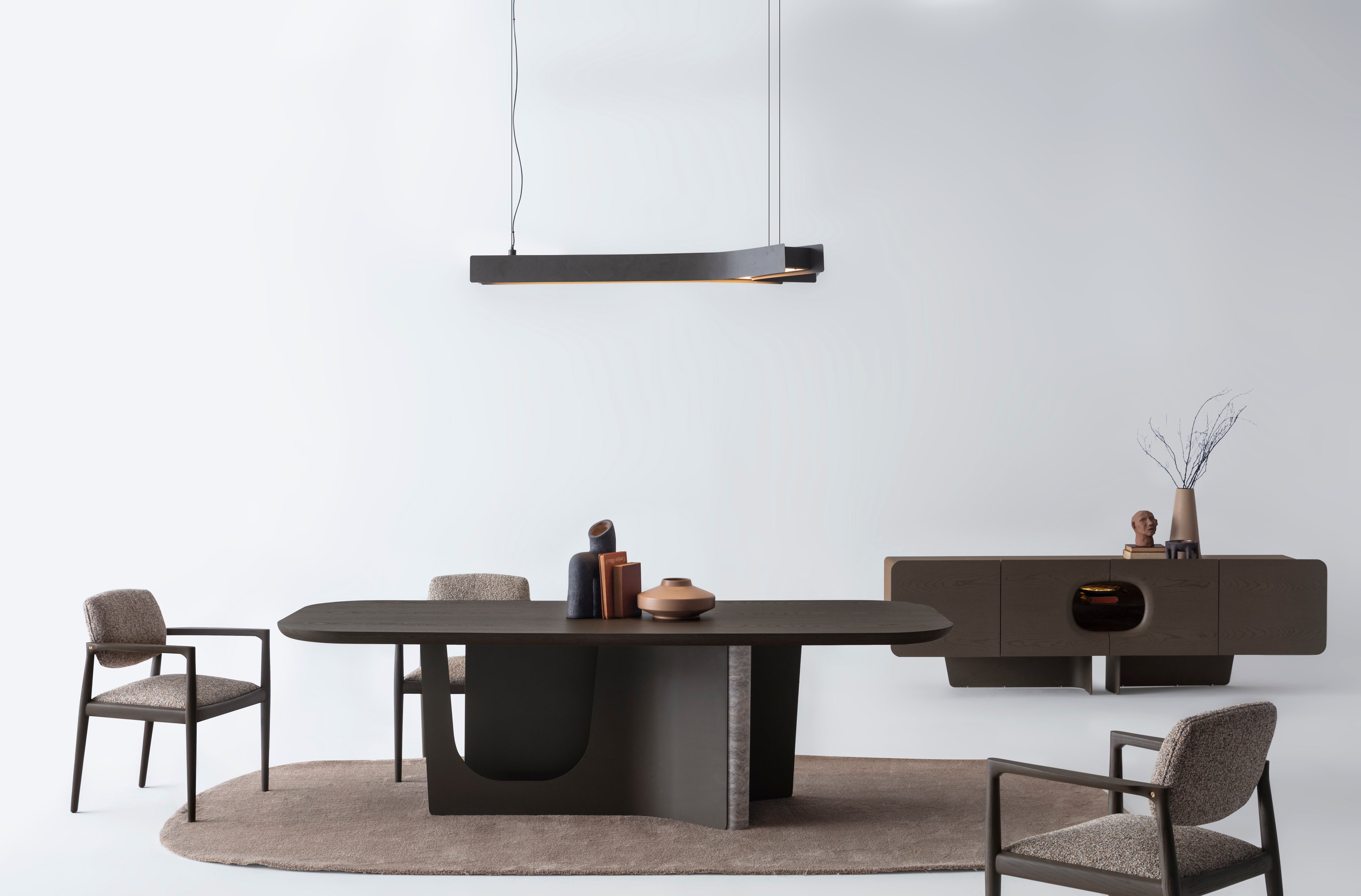The Bold dining table features a minimalist yet sculptural design, perfect for contemporary interiors. The table top is finished in elegant Light Oak veneer, offering a warm and natural touch. Its distinctive base, combining smooth curves with a marble-textured detail, creates a striking visual contrast while ensuring stability. With its soft, rounded edges and refined materials, this table seamlessly blends functionality and artistry, making it an ideal centerpiece for any dining space.