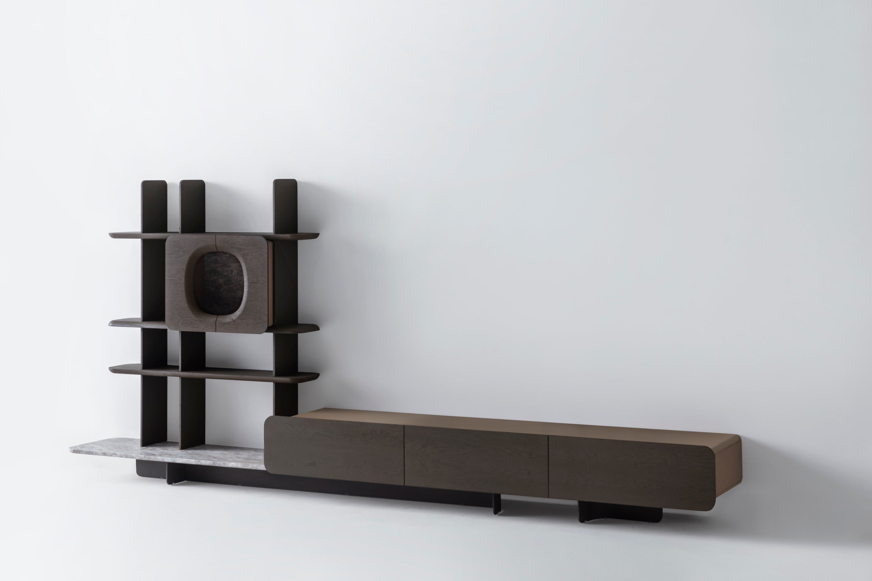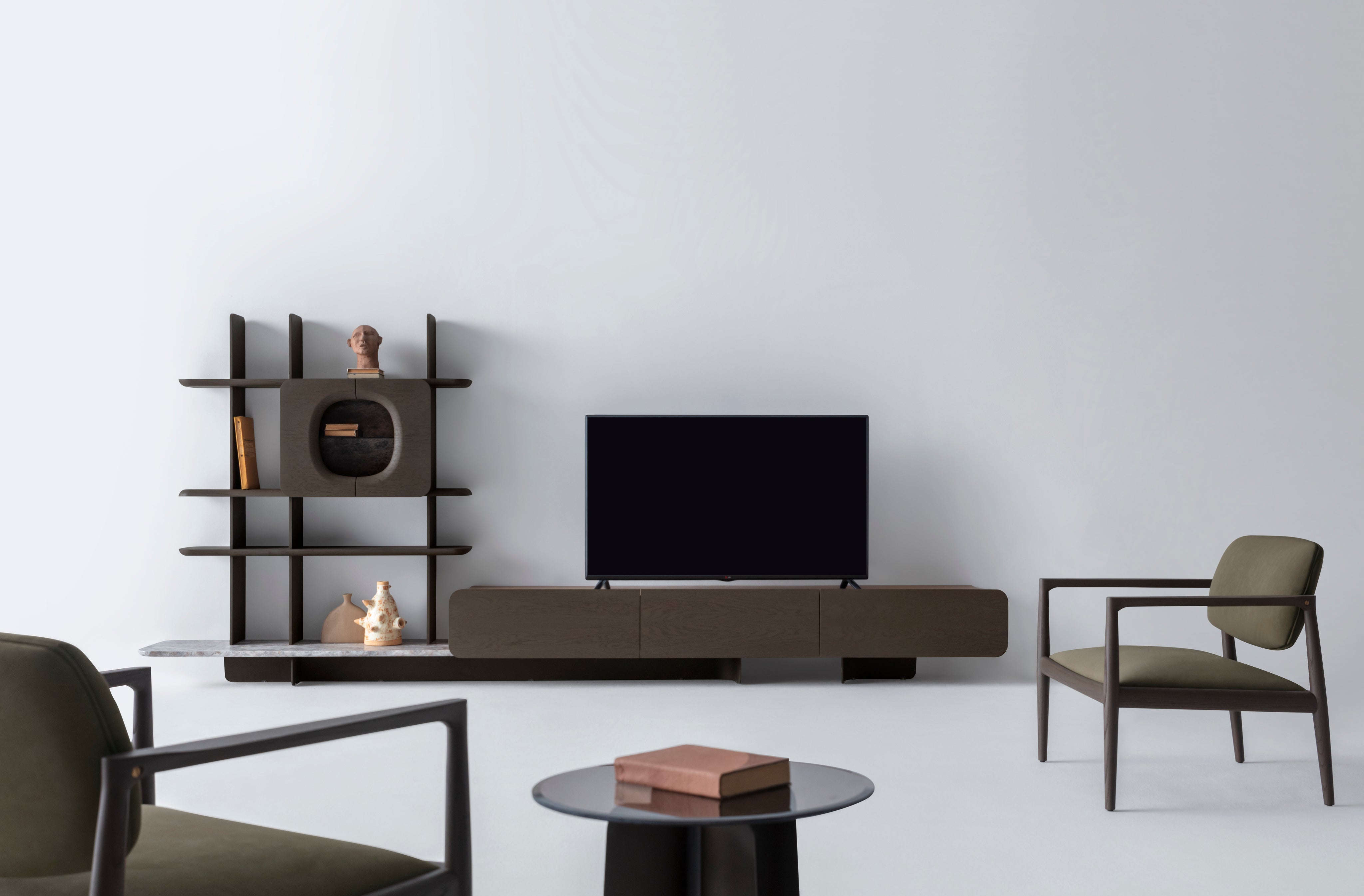 This elegant TV unit combines modern design with practical functionality. Crafted with Brown Oak veneer, it features smooth, rounded edges and a distinctive vertical shelving system for both storage and display. The central oval-shaped cutout adds a unique sculptural element, seamlessly blending aesthetics with purpose. Perfect for contemporary interiors, this unit elevates any living space with its sleek form and refined materials.