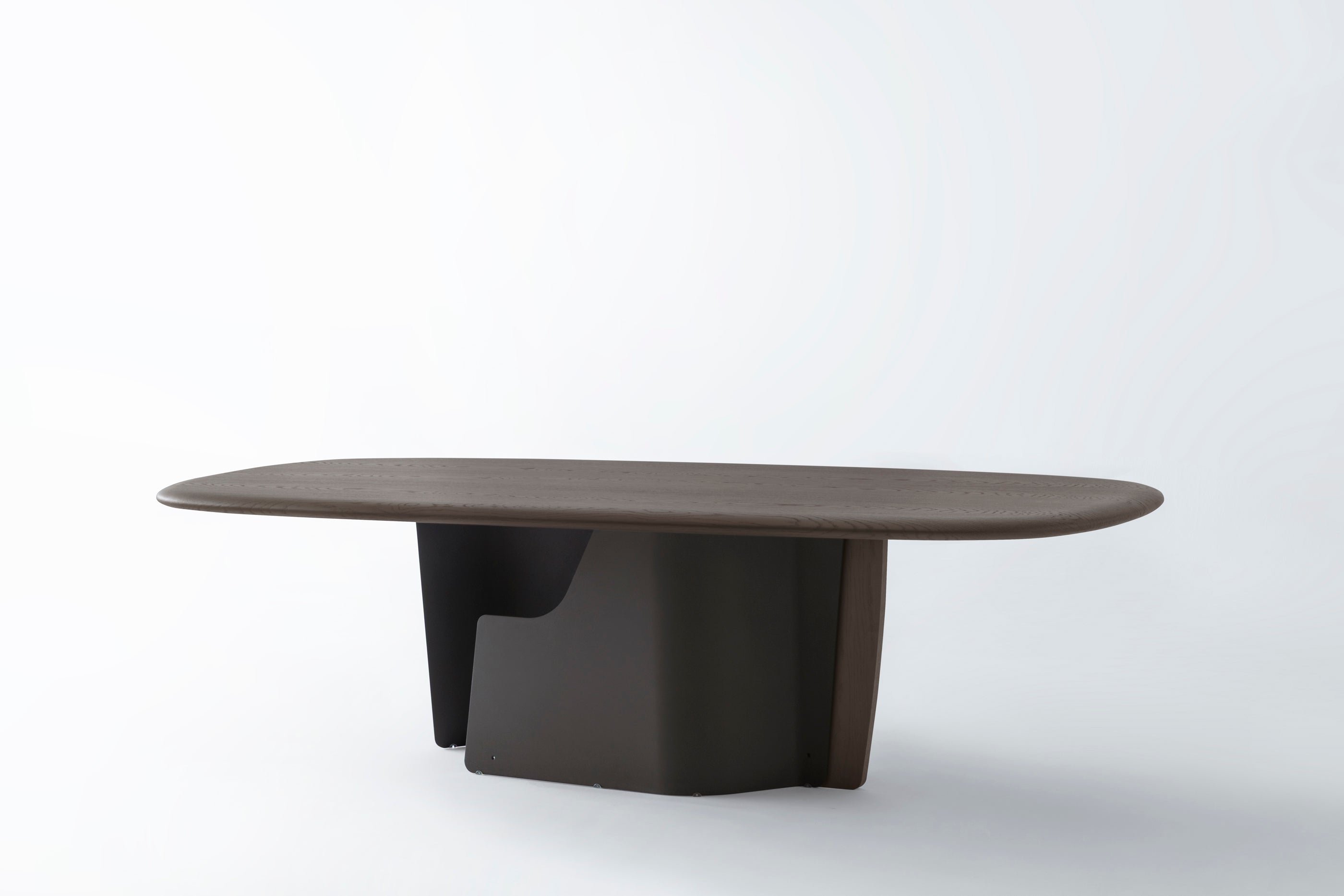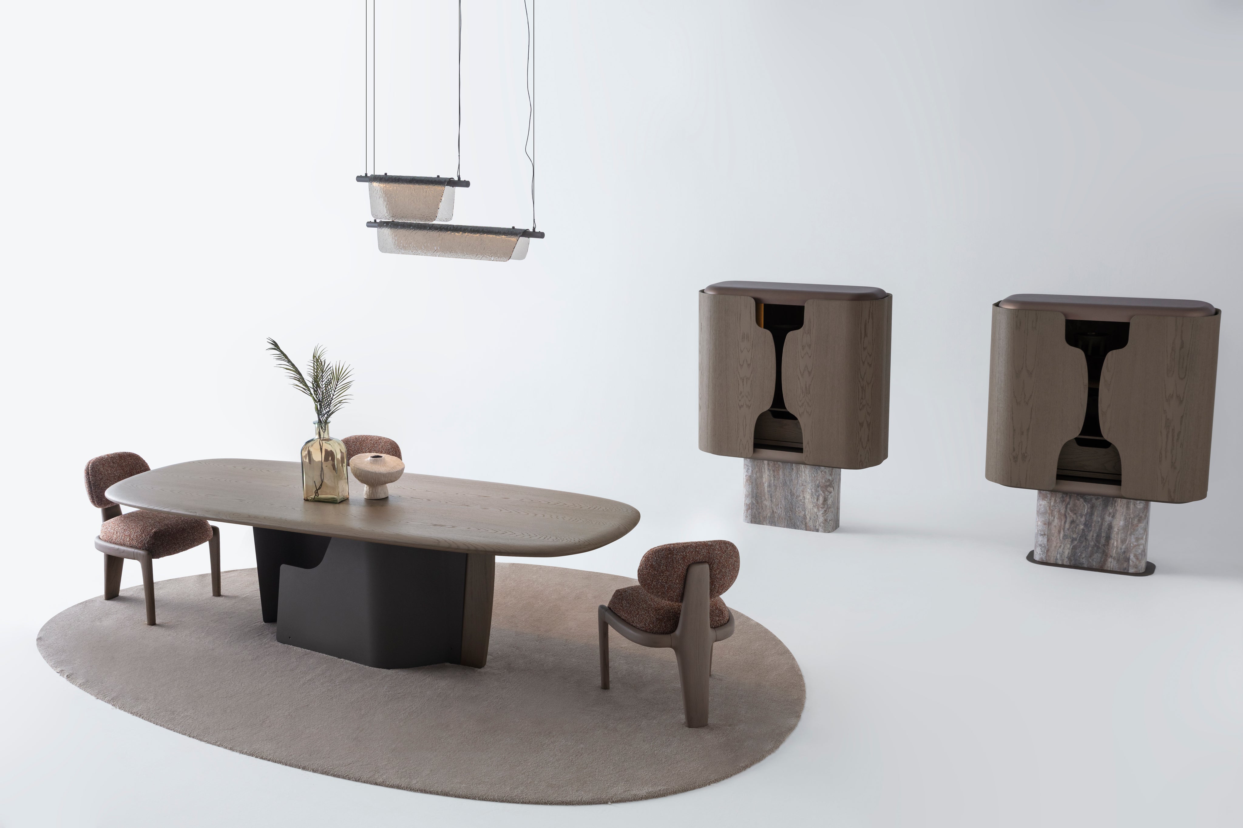 The sturdy base, made from a combination of metal and wood, provides excellent support while introducing a dynamic contrast between materials. Its asymmetrical structure adds a unique sculptural quality, transforming the table into a statement piece.